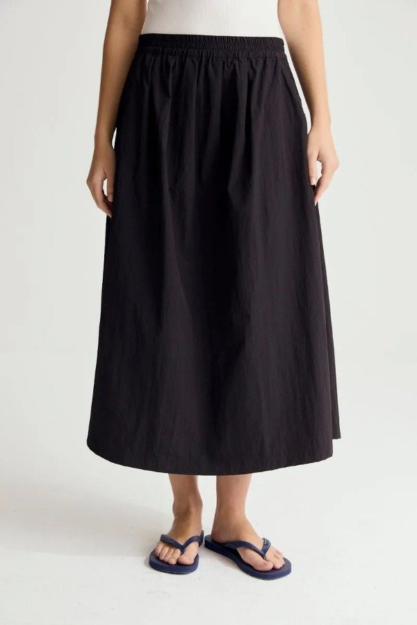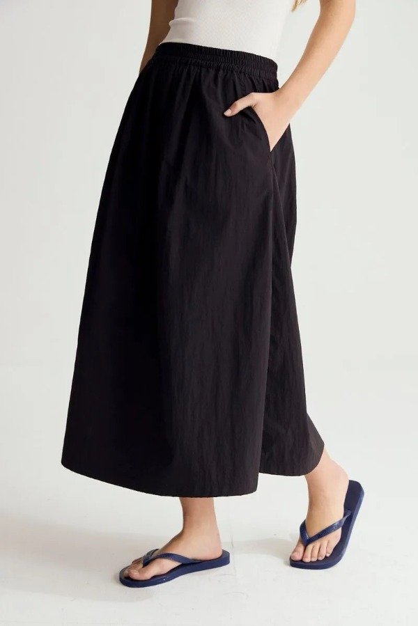 Falda midi de tiro alto y cintura con elástico. Tiene detalle de tabla en la cintura y bolsillos laterales. Falda con mucho vuelo realizada en tejido tipo tech