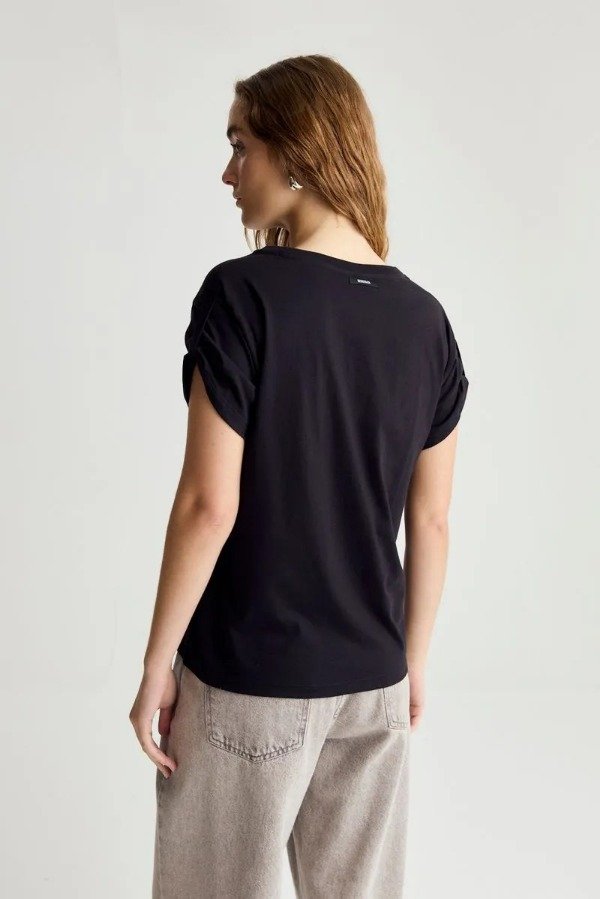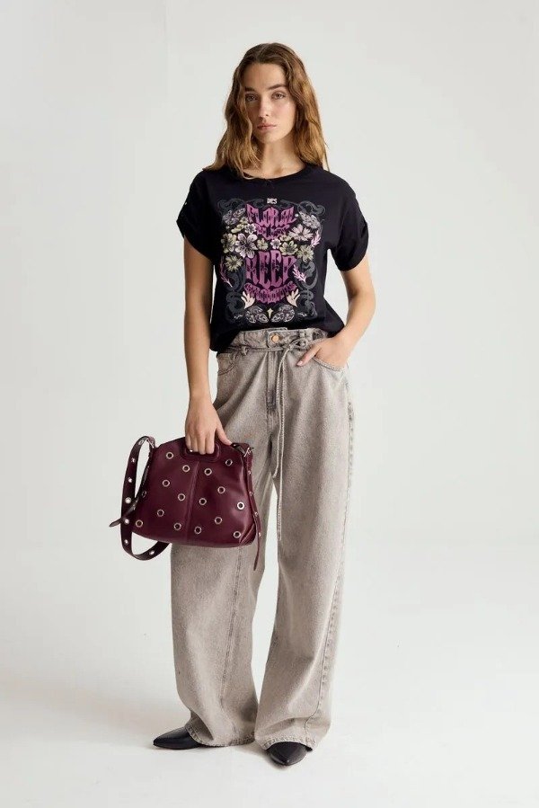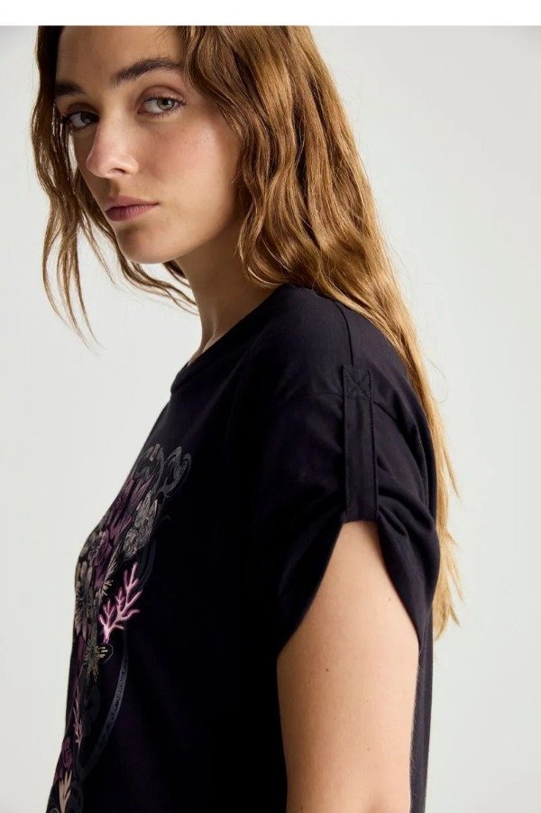 Remera de calce regular con escote redondo, detalle de trabitas en mangas y estampa central exclusiva de la temporada, confeccionada en jersey 100% algodon bci de calidad sustentable